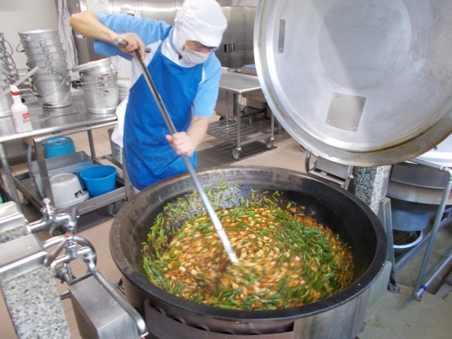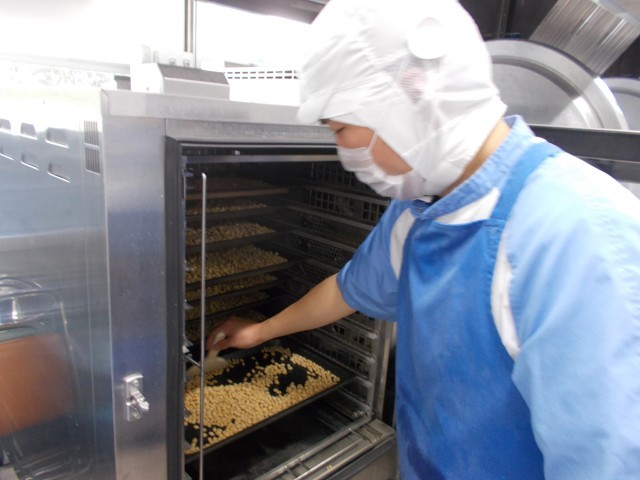 今日は絹ごし豆腐とイカのフリッターを入れたチリソースを作りました。ほんのりスパイシーな味付けでごはんによく合います。中華風野菜は、だいこんときゅうりとにんじんを特製のたれに漬けこみました。また、今日はココアの日なので、ココアをつかったデザートを作りました。大豆をゆでてからオーブンで焼き、三温糖で作ったみつを絡めてココアをまぶしました。