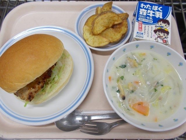 11月11日 照り焼きバーガー クラムチャウダー カントリーポテト 牛乳