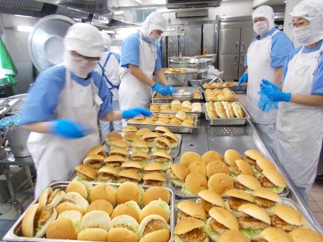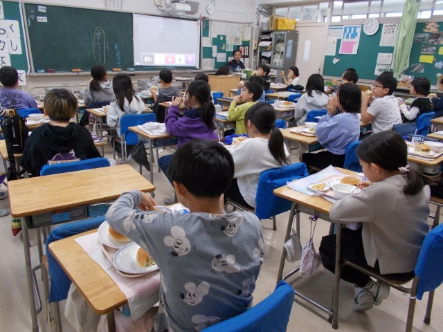 今日は全校遠足だったので、配膳しやすく、子どもたちが好きなメニューにしました。てりやきバーガーは、手作りのハンバーグに特製のたれをのせ、ゆでたキャベツと一緒にパンにはさみました。朝から「てりやきバーガー、楽しみ!」と声をかけてくれる子がたくさんいました。給食の時間にも、「これなら3個食べたい!」「最高!」とうれしい言葉をたくさんかけてもらいました。給食室は朝から大忙しでしたが、調理師さんが頑張ってくれました。クラムチャウダーはアサリ(魚介類)を入れたクリームスープで、今日はアサリのほか、旬の白菜をたっぷり入れ、豆乳、米粉で作ったので、あっさりとした仕上がりになりました。アサリは苦手な子が多いですが、思ったよりよく食べてくれていました。カントリーポテトは皮つきのジャガイモを油で揚げて、塩と黒こしょうをまぶしました。きたあかりを使ったので、ほくほくでおいしく、子どもたちも喜んでくれました。