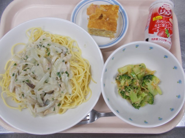 11月14日 キノコクリームスパゲッティ ブロッコリーとツナのサラダ アップルケーキ 牛乳