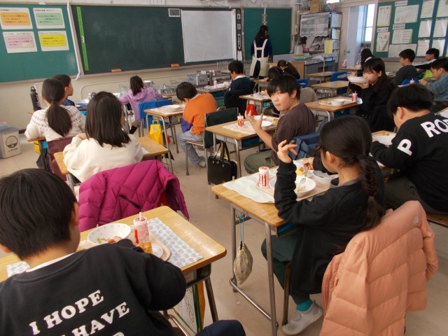 今日はエリンギ、えのきだけ、しめじの3種類のキノコを入れたクリームスパゲッティを作りました。サラダには、ブロッコリーとツナ、にんじんと玉ねぎなどをすり下ろして入れた特製ドレッシングを入れました。ケーキには、山形県の斎藤農園さんから届けていただいた紅玉を甘く煮ていれました。1年生では、「今日はぜんぶおかわりしたい!」と食べる前から嬉しそうに話してくれる子がいました。