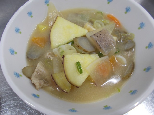 今日は目黒区が友好都市協定を結んでいる金沢市の料理を作りました。めった汁は「めったに食べることができない汁物」という意味で、むかしは豚肉が貴重だったことから、この名前になったそうです。今日は加賀野菜である源助大根と五郎島金時を入れました。ごはんには、加賀野菜である加賀レンコンをきんぴらにして入れました。しゃきっとした食感がおいしいご飯でしたが、「レンコンが苦手」という子もけっこういました。