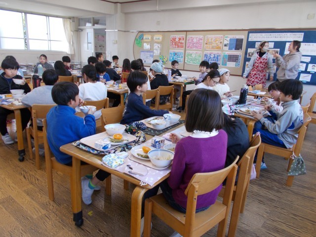 今日は4年2組がランチルームに来てくれました。今月の給食目標である「感謝して食べよう」についてお話をしました。「今日は全部食べられた。」とうれしそうに報告してくれる子が何人かいました。
