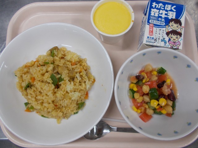 今日はメキシコの料理を作りました。ごはんにはカレー粉やチリパウダーなどを入れて、スパイシーな味付けにしました。サラダには、金時豆やヒヨコマメ、トマト、キュウリ、コーンを入れ、特製のドレッシングで和えました。トマトは苦手な子もいますが、好きという子もけっこういたので、「サラダがおいしい!」と喜んでくれる子もたくさんいました。フランは固めのプリンで、チーズやココナッツミルクなどを入れて作るレシピモもありますが、今日は練乳を入れて作りました。「プリンだ!」と喜んでくれる子がたくさんいました。