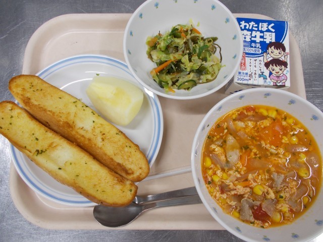 11月27日 ガーリックトースト トマトとたまごのイタリアンスープ 海藻サラダ りんご 牛乳