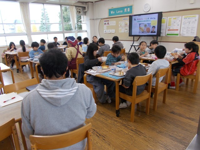 今日は給食委員会の児童が考えた献立の第三弾でした。みんなが好きなガーリックトーストに、旬のりんごを組み合わせたところがポイントです。スープは「トマトのスープ」というメニューでしたが、栄養のバランスを考え玉ねぎや豚肉、にんじん、コーン、たまごなども入れたスープにしました。今日は3年2組がランチルームに来てくれました。11月の給食目標の話もしっかり聞いてくれました。