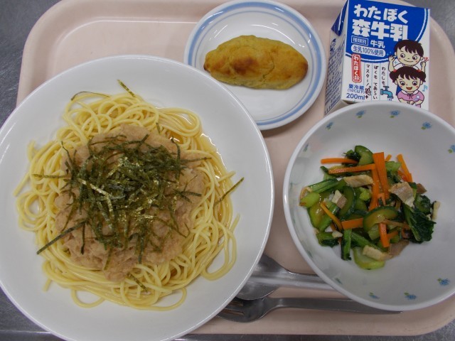 12月3日 大根とツナの和風スパゲッティ 小松菜とベーコンのサラダ スイートポテト 牛乳