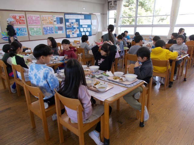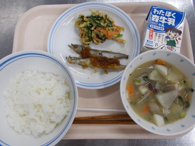 今日は12月8日のこと納にちなみ、おこと汁を作りました。おこと汁は、大根、こんにゃく、小豆、にんじん、里芋、ゴボウの6種類の食べ物を入れた汁物で、無病息災を願っていただきます。今日は3年1組がランチルームに来てくれたので、こと納以外にも日本の年中行事についてのお話をしました。ししゃもは米粉をまぶして油を塗ってオーブンで焼き、パインを入れたバーベキューソースをかけました。おいしくできましたが、苦手な子が多く、残ってしまい残念でした。ランチルームに来てくれた3年1組には、12月の給食目標についてもお話をしました。