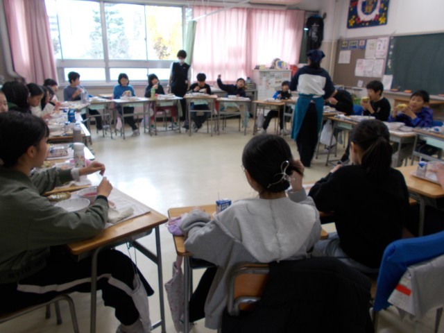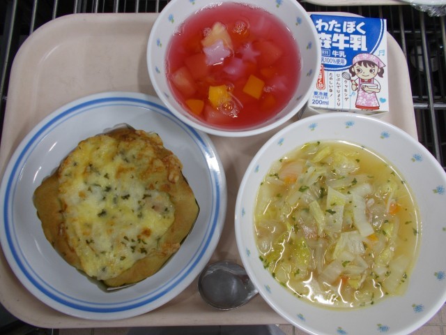 今日は明日葉パウダーを練りこんだパン生地を作り、中にポテトグラタンをつめて、チーズをのせて焼きました。ほんのり緑色のパン生地はふわふわでおいしく、子どもたちも大喜びでした。スープには旬の白菜をたっぷり入れました。デザートは、クランベリージュースをつかって作ったシロップと缶詰のフルーツ、星形のナタデココを合わせて、赤いフルーツポンチを作りました。今日はクラスの中で机で大きな円を作ったり、いつもとは違うグループに机を合わせて食べたりと、楽しみながら給食を食べているクラスがたくさんありました。明日から冬休み、今日で給食も終わりです。新年は1月9日より給食が始まります。