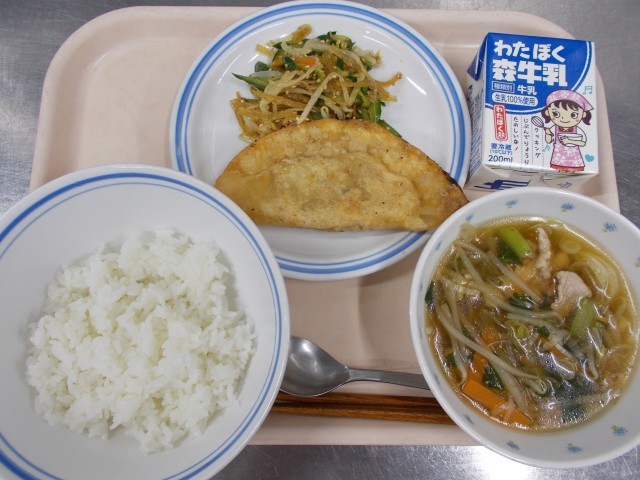 1月13日 ごはん はるさめスープ ジャンボぎょうざ 糸寒天の中華風サラダ 牛乳
