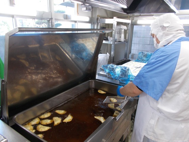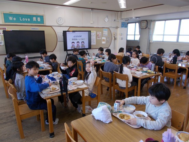 今日は子どもたちの好きなジャンボ餃子を作りました。具は豚ひき肉、にんにく、しょうが、長ネギ、にら、キャベツと普通の餃子と同じですが、皮の大きさが低学年で13㎝、中学年・高学年で15㎝のものを使っています。ランチルームに来てくれた2年2組の子は、ジャンボぎょうざのバットのふたを開けるなり、「わぁ!おいしそう!」ととても喜んでくれていました。ランチルームでは、1月の給食目標「学校給食について知ろう」についてお話ししました。