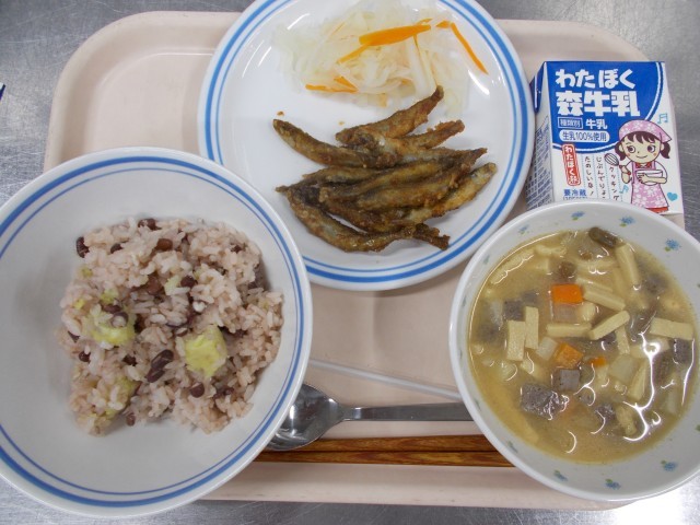 1月15日 小豆とさつまいものごはん けの汁 わかさぎの甘露煮 紅白なます 牛乳