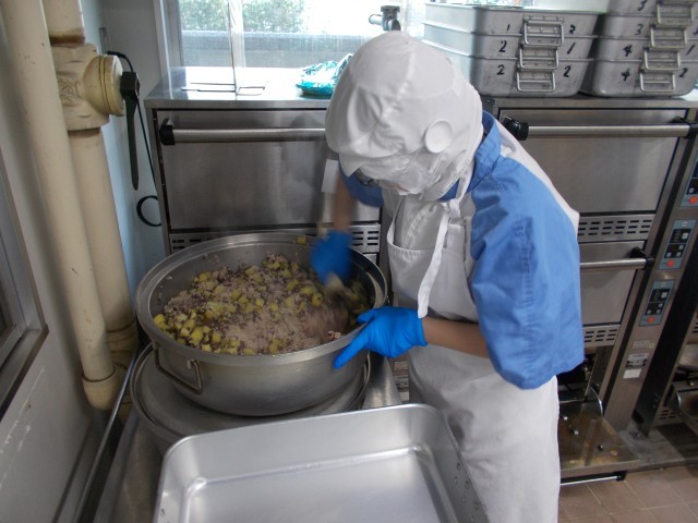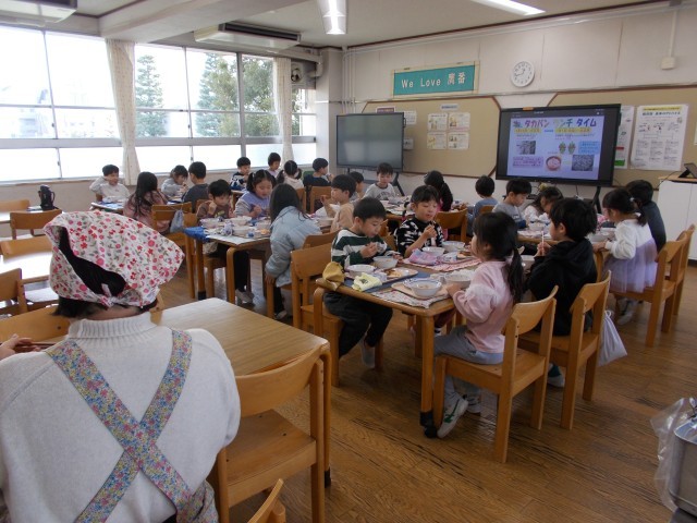 今日は小正月なので、小豆粥のかわりに小豆とサツマイモを炊き込んだご飯を作りました。ほんのり甘くておいしいご飯でした。けの汁は、野菜や山菜を小さく刻んで入れた汁物で、東北地方ではお正月に食べるそうです。今日は大根、にんじん、ごぼう、凍り豆腐、大豆、こんにゃく、ぜんまいを入れました。ワカサギはでんぷんをつけて油で揚げ、甘辛いたれを絡めた甘露煮にしました。紅白なますは、酸っぱすぎないよう、食べやすい味に作りましたが、苦手という子が多かったようです。今日は1年1組の子どもたちがランチルームに来てくれました。静かにしっかりお話をきくことができました。