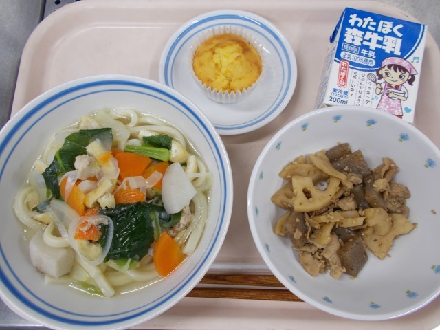 1月22日 しっぽくうどん レンコンの炒め煮 ミカンのカップケーキ 牛乳