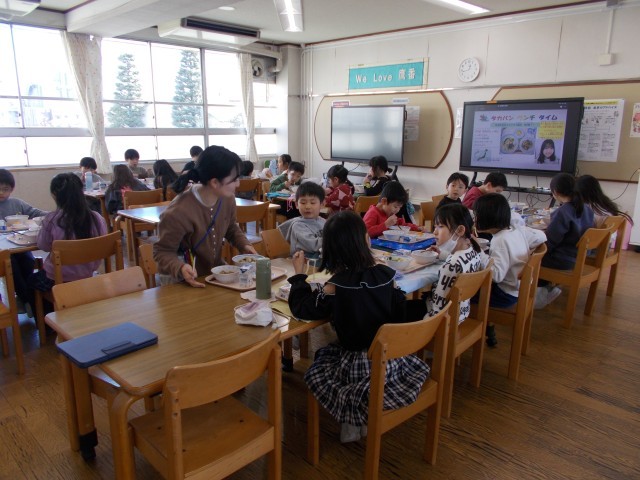 今日は給食委員会の児童が考えた献立第9弾でした。しっぽくうどんは香川県の郷土料理で、冬が旬の野菜をたっぷり使ったうどんです。煮干しでだしをとってるのもとくちょうです。レンコンの炒め煮は、豚肉とこんにゃく、レンコンを炒め煮にしました。ミカンのカップケーキは、みかんを約100こ使ってジャムを作り、ミカンの果皮はみじん切りにして入れました。さわやかな甘さのケーキで、子どもたちもよく食べてくれました。