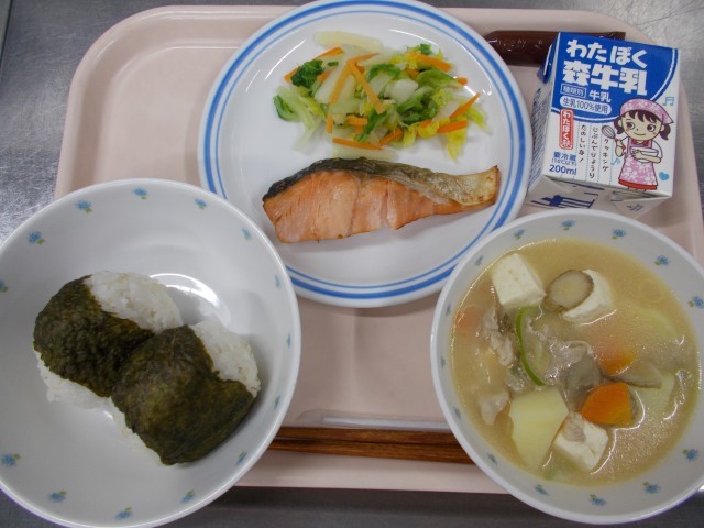 1月26日 塩おにぎり 豚汁 鮭の塩焼き 即席漬け 牛乳 ミルメーク
