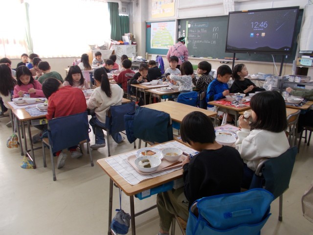 今日は1月24日の給食記念日にちなみ、初めての給食のメニューを再現しました。「塩おにぎり、鮭の塩焼き、つけもの」が初めてのメニューですが、今日は栄養のバランスを考え、豚汁をつけました。また、子どもたちからリクエストのあったミルメーク(ココア)を提供しました。1年生では、初めて出るミルメークに興味津々で、なかなか食事の方に気が向かない子もいたようです。今日は全員分で900個くらいのおにぎりを作るのが大変でしたが、調理師さんが頑張ってくれました。