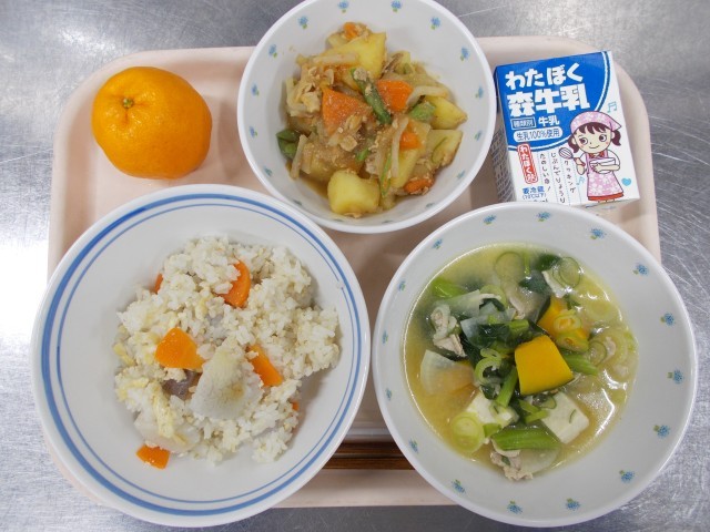 今日は給食週間の昔の給食シリーズ第3弾でした。大正時代の給食で五色ごはんと栄養みそ汁を作りました。栄養みそ汁には豚肉やかぼちゃ、豆腐、小松菜、長ネギ、大根を入れました。ごはんには里芋とニンジン、鶏ひき肉、こんにゃく、油揚げを入れました。今日は全体的にボリュームがあったので、少し残ってしまい残根でした。