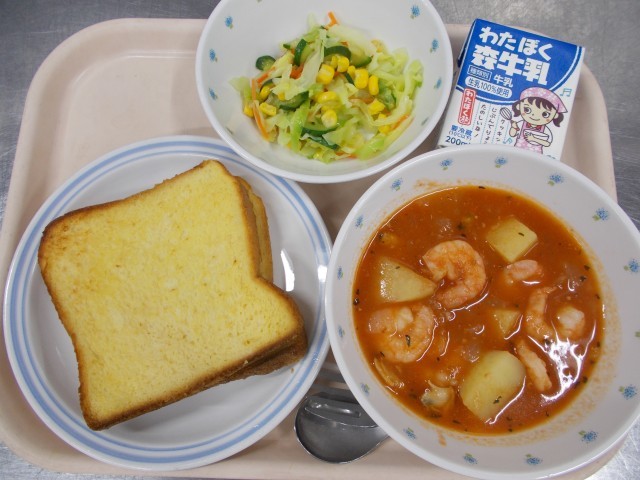 今日はフランスの料理特集でした。クロックムッシュは、パンにパリのオペラ座近くのカフェで生まれたメニューと言われています。パンにベシャメルソースやチーズ、ハムをのせて焼いたサンドイッチのようなものですが、給食では卵と豆乳でフレンチトーストの液を作って食パンを浸し、ハムとチーズをはさんで焼きました。ブイヤベースは魚介類をたっぷりつかったスープです。今日はアサリとたらとエビを入れました。魚介のうまみたっぷりのおいしいスープでしたが、「アサリが苦手、、」「エビが苦手、、」という子がけっこういました。
