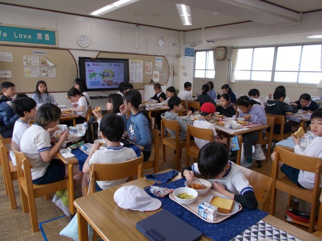 今日は4年1組がランチルームに来てくれました。2月の給食目標「バランスよく食べよう」の話を、朝ごはんを振り返りながらすることで、自分事になったようです。