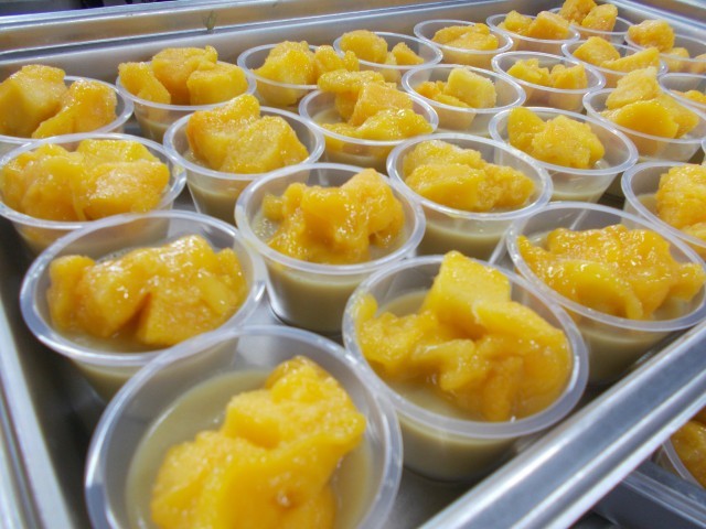今日はピリッと辛い四川豆腐を作りました。マーボー豆腐に似ていますが、味付けや野菜の切り方が違います。ジャガイモの中華風サラダは、ジャガイモを千切りにして、さっとゆでているので、しゃきっとした食感がおいしいです。マンゴープリンは、マンゴージュースと豆乳をベースに作ったので、あっさりとしたあまさがおいしいデザートでした。