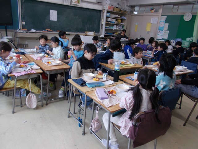 今日は子どもたちの好きなガーリックトーストを作りました。オリーブオイルとにんにく、パセリを合わせて、ソフトフランスパンの断面に塗り、オーブンで焼いて作ります。ビーフシチューは角切りの牛肉を2時間くらいじっくり煮たので、とてもやわらかくおいしくできました。くだものは旬のかんきつ(みかんのなかま)食べ比べです。今日はきよみオレンジとブラッドオレンジの2種類です。ブラッドオレンジは見た目の色で苦手、という子もいましたが「食べてみたらこっちの方がすきだった!」という子も何人もいて、良い食の経験になったと思いました。