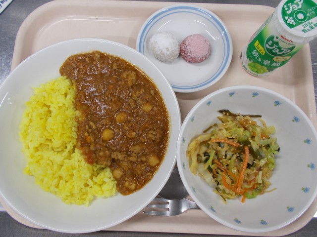3月23日 キーマカレー 海藻サラダ 紅白スノーボール ジョア