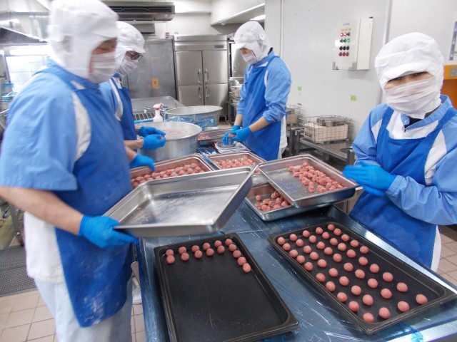 今日は今年度最後の給食だったので、子どもたちの好きなメニューにしました。また、6年生の卒業をお祝いして、紅白のスノーボールクッキーを作りました。バターと砂糖、薄力粉を合わせて生地を作り、丸めて焼いた後に粉砂糖をまぶしました。ピンク色はフリーズドライのいちごパウダーを使いました。各教室では最後の給食の時間を、大きな輪になって食べているところが多くありました。今年度も安心・安全を第一に、子どもたちの思い出に残る給食を作ることができ、よかったと思っています。
