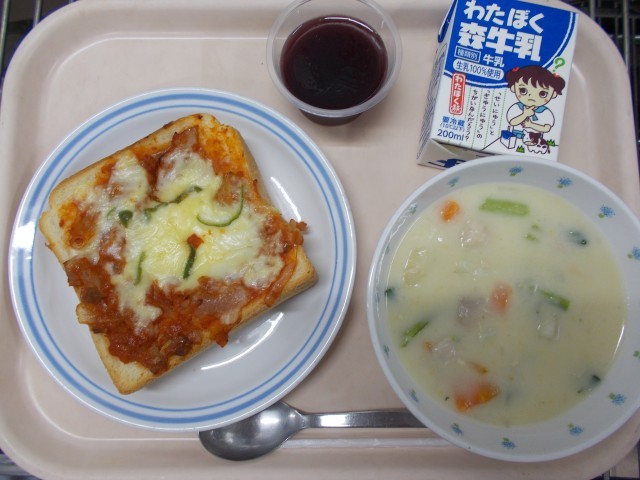 4月10日 ピザトースト 野菜のクリームシチュー ブドウゼリー 牛乳