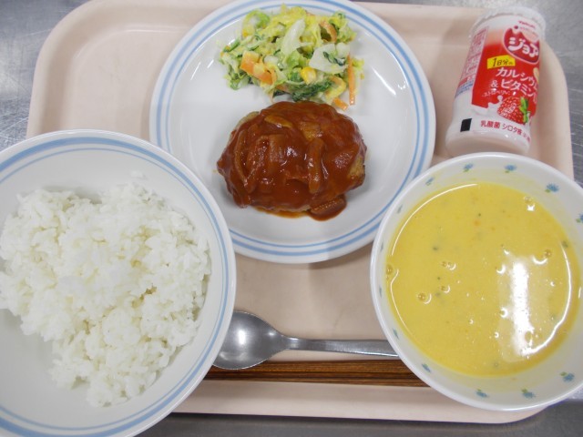 今日は給食室手作りのハンバーグでした。豆腐を入れたので、ふんわりとやわらかく、とてもおいしくできました。朝から「今日はハンバーグだ!」と楽しみにしてくれている子もいました。ポタージュには、玉ねぎ、にんじん、白いんげん豆をじっくり煮てミキサーにかけ、牛乳や豆乳、生クリームを入れて作りました。なめらかでおいしく、野菜が苦手な子も食べやすかったようです。