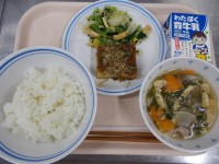 今日は春が旬のヨモギを使って草団子を作りました。白玉粉と薄力粉、ヨモギを合わせて丸めてゆで、きなこをまぶしました。全員分で1700こくらいの団子を、調理師さんが丁寧に丸めてくれました。のどに詰まらないよう、よくかんで食べるよう指導しました。竹輪の磯部焼きは、青のりとノンエッグマヨネーズ、薄力粉を合わせて、ちくわにまぶして焼きました。今までは油で揚げて作っていましたが、今日はスチームコンベクションオーブンで焼くレシピに変更しました。