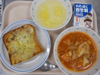 今日はイタリア料理特集でした。ペンネはペンの先の形をしたパスタを、ピリッとからいトマトソースで和えたパスタです。今日は全員分で33キロのトマト缶を、炒めたベーコンや玉ねぎと合わせてソースを作りました。ちょうどよい辛さで、子どもたちもよく食べてくれました。カリカリパンのサラダは、低温で焼いて作ったクルトンをのせたサラダです。ビスコッティはイタリアの伝統的なお菓子で、二度焼きするので固いのが特徴です。本場ではコーヒーに浸して食べるそうです。今日は2度焼きの時間を短くし、食べやすい堅さに仕上げました。端の部分をおまけで入れたクラスは、とても喜んでくれました。
