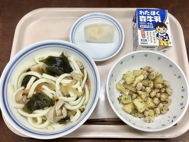 朝からかつおと昆布でしっかりだしを取り、その汁に鶏肉、わかめ、野菜が入り栄養価の高いうどんに仕上げました。