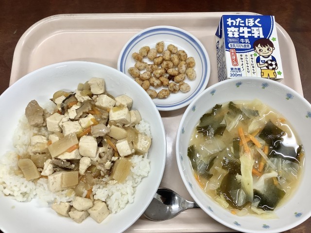 たけのこや玉ねぎなどの野菜を炒め、かつおだしで煮込みました。さいの目にした豆腐は別で煮た後、野菜と合わせ、豆腐が崩れないように気をつけながらでん粉でとろみをつけるのがポイントです☝️
