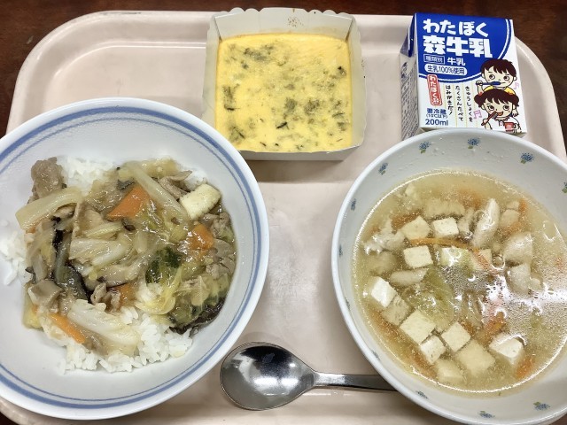 豚肉やいか、きくらげ、白菜などの野菜を炒めて、かつおだしを加えてからでん粉でとろみをつけ栄養満点な中華丼にしました!