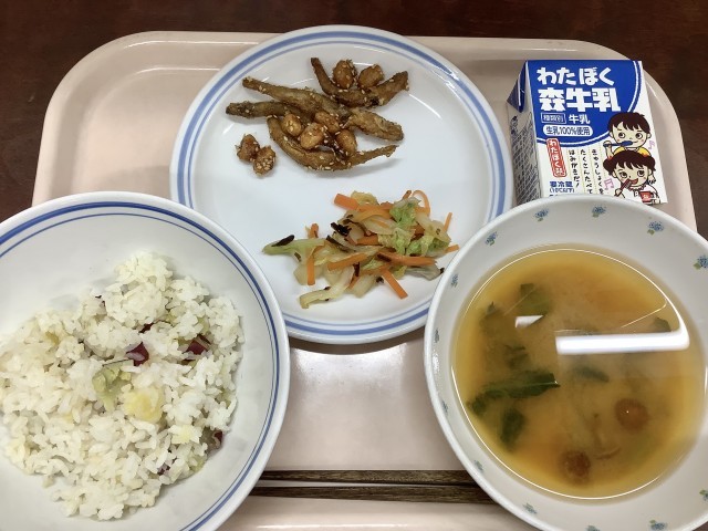 さつまいもご飯は、角切りにした皮付きのさつまいもをご飯と一緒に炊きました🍚色合いがよく、きれいに仕上げました🍠