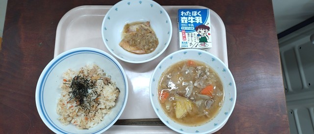 今日は、きのこご飯です🍚きのこは、しめじ、えのきたけ、しいたけを入れました😋他にも油揚げや豚肉、にんじん、ひじきを加え食べ応えのある一品に仕上げました!