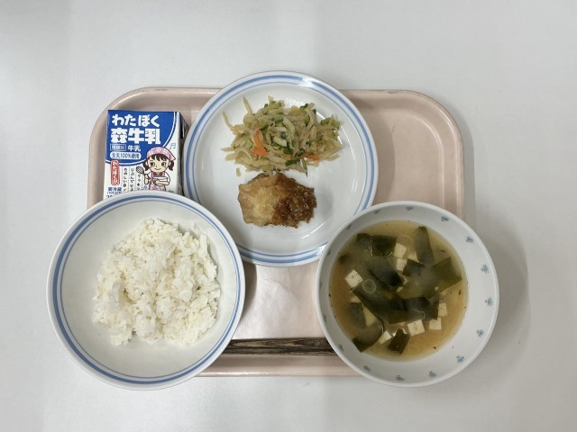 令和8年2月10日 公開日 2026/02/14 更新日 2026/02/14 今日の給食 ⭐︎今日の献立⭐︎・ご飯・鶏肉の香味揚げ・切り干し大根のカミカミ和え・みそ汁・牛乳⭐︎食材の産地紹介⭐︎鶏肉 (鹿児島)豆腐 (愛知・佐賀)切干大根 (宮崎)にんにく (青森)生姜 (高知)にんじん (千葉) 長ねぎ (千葉)きゅうり (宮崎) いいね(0)
