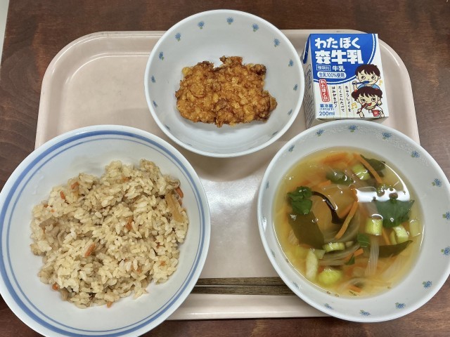 チンゲン菜とわかめのスープは、かつお出汁に、にんじんやチンゲン菜などの具材を入れ煮て、味付けをしました🥣コショウがピリッと効いていて少し大人っぽい味となりました!