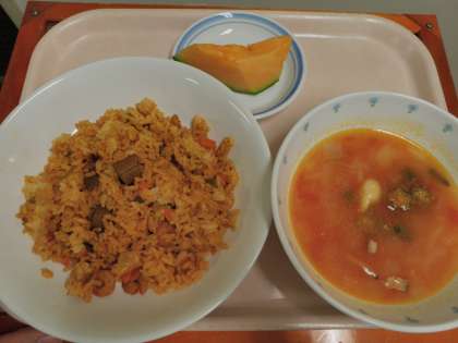 6月10日 ジャンバラヤ ガンボスープ メロン 牛乳 公開日 2014/06/11 更新日 2014/06/11 今日の給食 《こんだて》 ★ジャンバラヤ ★ガンボスープ ★メロン ★牛乳 《食材の産地》 鶏肉(鳥取)、えび(マレーシア)、メロン(茨城)、にんにく(青森)、セロリ(長野)、玉ねぎ(兵庫)、にんじん(千葉)、ピーマン(高知)、オクラ(鹿児島) いいね(0)