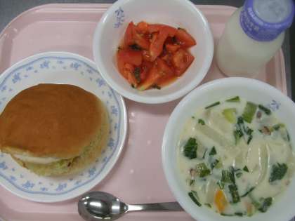 9月2日 タンドリーチキンバーガー 青梗菜のクリームスープ トマトとバジルのサラダ 牛乳
