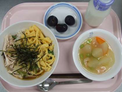 今日は九州の鹿児島県奄美大島の郷土料理である鶏飯(けいはん)を作りました。ゆでてほぐした鶏肉と、錦糸卵をごはんにのせて、鶏でとったスープをかけます。給食室では、鶏の胸肉をほぐすのが大変でした。鶏飯お茶漬けのようで食べやすく、子どもたちにも人気がありました。しかし、インフルエンザや体の調子が悪くお休みしている子も多いので、少し残ってしまいました。