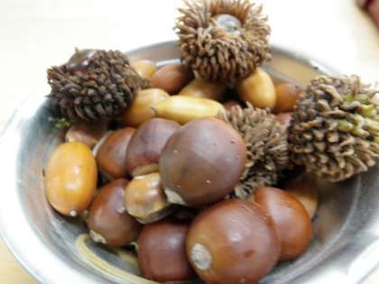丸いどんぐりはクヌギの木、長細いのはシイの木のどんぐりです。