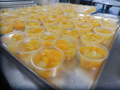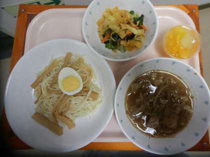 2年生のリクエスト給食でした。デザートのフルーツポンチゼリーは、缶詰のフルーツと、サイダー入りのゼリーを入れて固めました。つけめん、パリパリサラダも人気があり、リクエストの定番になっています。