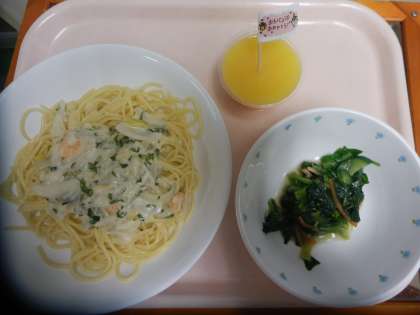3月4日 レモンクリームスパゲティ ほうれん草とベーコンのサラダ オレンジ寒天 牛乳 公開日 2014/03/05 更新日 2014/03/05 今日の給食 《こんだて》 ★レモンクリームスパゲティ ★ほうれん草とベーコンのサラダ ★オレンジ寒天 ★牛乳 《食材の産地》 にんにく(青森)、玉ねぎ(北海道)、ルッコラ(愛知)、きゅうり(群馬)、にんじん(千葉)、レモン(愛媛)、むきえび(マレーシア)、ほたて水煮(青森)、ほうれん草(東京) いいね(0)