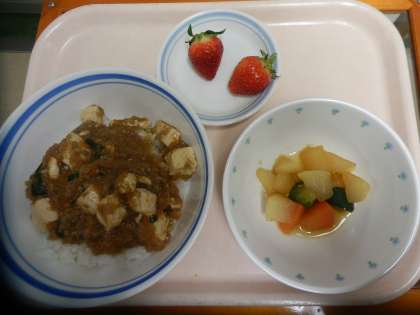 3月5日 麻婆豆腐丼 中華風野菜 いちご 牛乳 公開日 2014/03/06 更新日 2014/03/06 今日の給食 《こんだて》 ★麻婆豆腐丼 ★中華風野菜 ★いちご ★牛乳 《食材の産地》 豚ひき肉(鹿児島)、しょうが(熊本)、にんにく(青森)、にんじん(千葉)、玉ねぎ(北海道)、長ねぎ(千葉)、にら(茨城)、きゅうり(群馬)、大根(徳島) いいね(0)