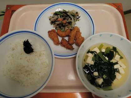 5月1日 ごはん のりの佃煮 いかのかりん揚げ 大根とひじきのサラダ すまし汁 牛乳 公開日 2014/05/01 更新日 2014/05/01 今日の給食 《こんだて》 ★ごはん ★のりの佃煮 ★いかのかりん揚げ ★大根とひじきのサラダ ★すまし汁 ★牛乳 《食材の産地》 ひじき(長崎)、糸削り(鹿児島)、大根(千葉)、にんじん(徳島)、きゅうり(岩手)、小松菜(埼玉)、いか(青森) いいね(0)