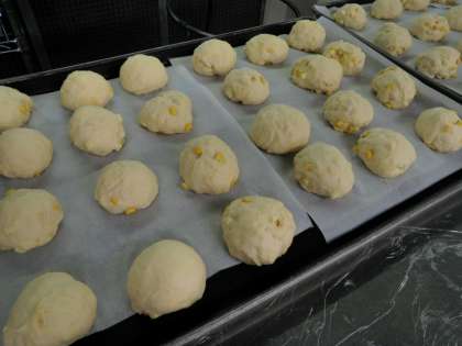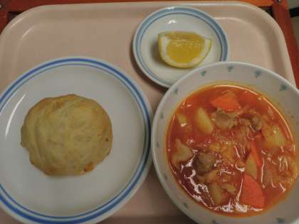 5月の手作りパンは、コーンチーズパンです。パン生地にホールコーンとダイスチーズを混ぜ込み、丸めて焼きました。果物はニューサマーオレンジです。見た目がレモンに似ているのですが、酸味が少なくて食べやすい果物です。