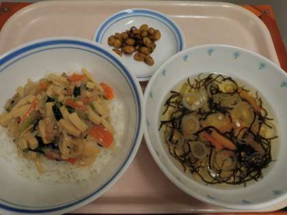 5月15日 うま煮丼 ぶどう豆 もずくスープ 牛乳 公開日 2014/05/15 更新日 2014/05/15 今日の給食 《こんだて》 ★うま煮丼 ★ぶどう豆 ★もずくスープ ★牛乳 《食材の産地》 豚肉(鹿児島)、にんじん(徳島)、玉ねぎ(千葉)、長ねぎ(千葉)、たけのこ(福岡)、もずく(沖縄) いいね(0)