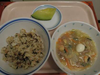 5月22日 高菜ごはん タイピーエン メロン 牛乳 公開日 2014/05/22 更新日 2014/05/22 今日の給食 《こんだて》 ★高菜ごはん ★タイピーエン ★メロン ★牛乳 《食材の産地》 しょうが(高知)、にんじん(徳島)、玉ねぎ(佐賀)、キャベツ(神奈川)、青梗菜(静岡)、いか(ペルー)、えび(マレーシア)、メロン(茨城)、豚肉(鹿児島) いいね(0)